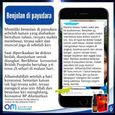 | Kista dan Miom | Mengurangi ukuran kista dan gejala yang terkait. | "Ukuran kista saya mengecil setelah menggunakan British Propolis." |