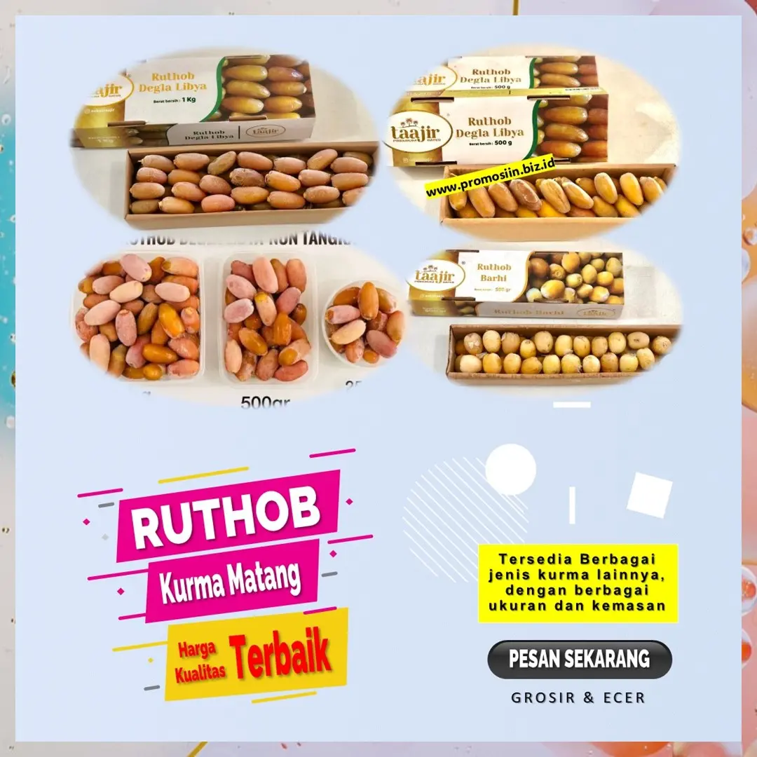 Kurma Ruthob termasuk kurma segar yang berwarna kuning hingga coklat muda, memiliki tekstur lembut dan rasa manis yang segar . Kurma ini sering kali disebut kurma muda karena dipetik sebelum matang sempurna, tapi justru itulah daya tariknya . Kurma Ruthob memiliki kandungan serat dan vitamin yang tinggi, terutama vitamin C, yang bagus untuk daya tahan tubuh . Kadar kelembapan yang lebih banyak dibandingkan kurma kering membuat kurma ini sangat menyegarkan, terutama di musim panas atau saat berbuka puasa .